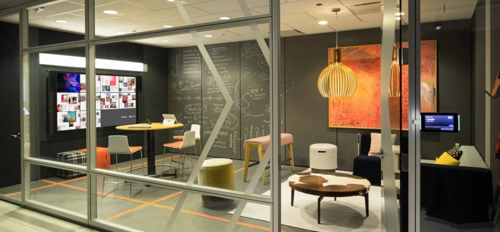 Adding acoustically absorptive materials improves this condition. Absorptive materials take many forms. Acoustical ceilings, acoustical wall panels and carpet are a few we all know. Acoustical ceilings seem to have become an unattractive alternative to many. The look of the exposed building lends a feel that is more in line with the brand of many occupiers. When ceilings and carpet are not a part of the design, it is the responsibility of the workplace design team to strategically add absorptive materials in other places.